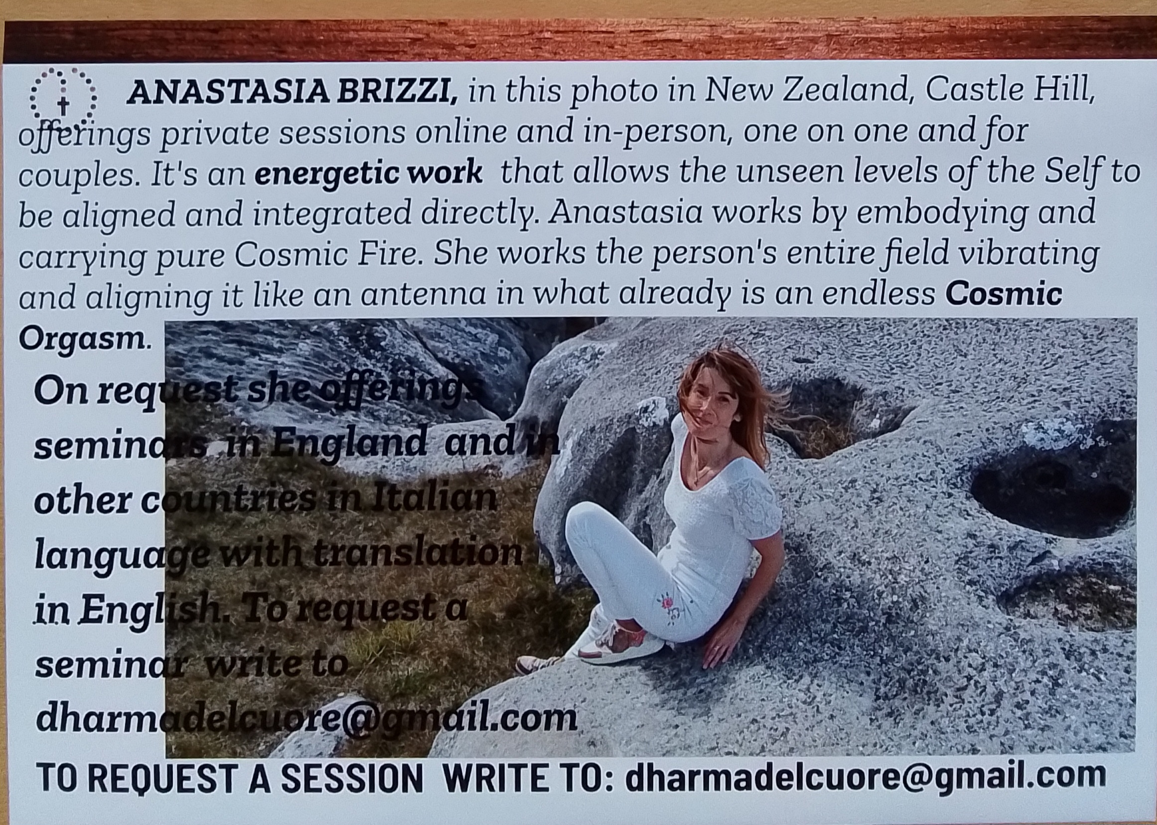 RISVEGLIARE LA LUCE INTERIORE, INTEGRARE LE FREQUENZE DEL SILENZIO COSMICO NEL PROPRIO CAMPO ENERGETICO, FISICO E SPIRITUALE, ED ESSERE COSI STRUMENTO DI ALLINEAMENTO DELLA VITA TUTTA AL DIVINO ….. Arrendersi al Flusso Eterno della Vita, essere il Flusso stesso. ANASTASIA è Insegnante di Presenza, formatasi alla scuola per Insegnanti di Presenza di ECKHART TOLLE.… ma IN VERITA’ DIO stesso la “forma” incessantemente dall’Eterno.